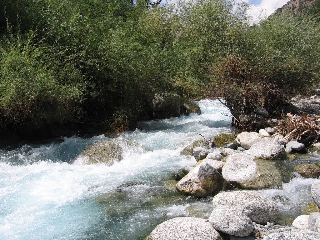 Continue up the trail through the pine forest, passing other cabins along the way. The forest will be gone in fifteen minutes. Ibex herds live in Kundar Gol, a side stream to the east. Livestock overgrazing is obvious. Continue up the steep route along the true left bank of the Roghili Gol until the trail fades. Many of the willows that line the creek have been nibbled down by goats. Buthijhal (3030 m) takes between one and eleven hours to reach. West of the stream, big birch trees (buthi) can be seen. Buthijhal also functions as a grazing area and includes a few bungalows. Canals on both sides of the valley may be mistaken for paths.